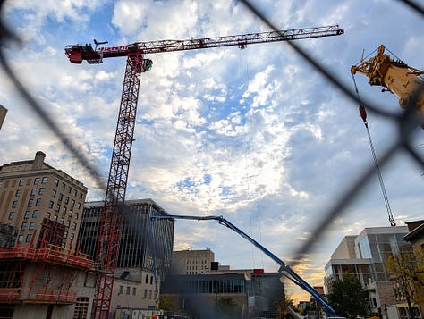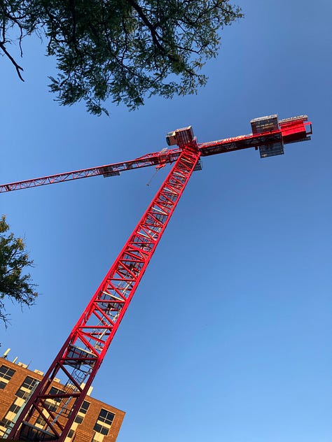 And they’re always there, somewhere. They move around, but you’ll always be able to find a crane in your city, because the project of progress is never complete. If you’re not building, you’re crumbling.