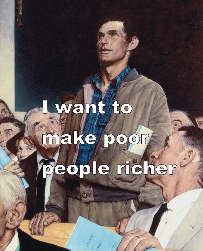 …and the enormity of any project which plans to efficiently incentivize people to do all that labor with anything other than money. Having leak-proof homes alone requires an absolutely massive amount of human labor, most of which happens at stages of the supply chain invisible to you. That massive logistics project works because at every stage of the way, the laborers can be seamlessly rewarded with money. In fact that’s what money is - a medium of exchange. It the thing that allows you to reward people quickly and efficiently, with something you know they’ll like, rather than digging around in your closet for something to offer them. We would not be able to live in the comfort and safety we’re accustomed to if we were all digging around in our closets for something to offer the roofers, and they were digging around in their closets for something to offer their suppliers, and their suppliers were digging around in their closets for something to offer the raw materials extractors, etc. A free market is just a way to reward people efficiently, so we can get back to doing the actual work. Having a leak-proof house requires enormously more work than you think. Poor people will not have reliably leak-proof houses in the winter without capitalism and industrialization.